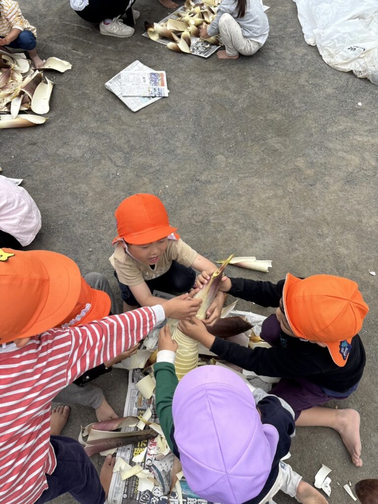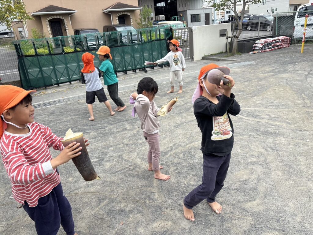 剥いた皮を望遠鏡にしたり、帽子のように被ったり楽しく遊んだ子ども達!