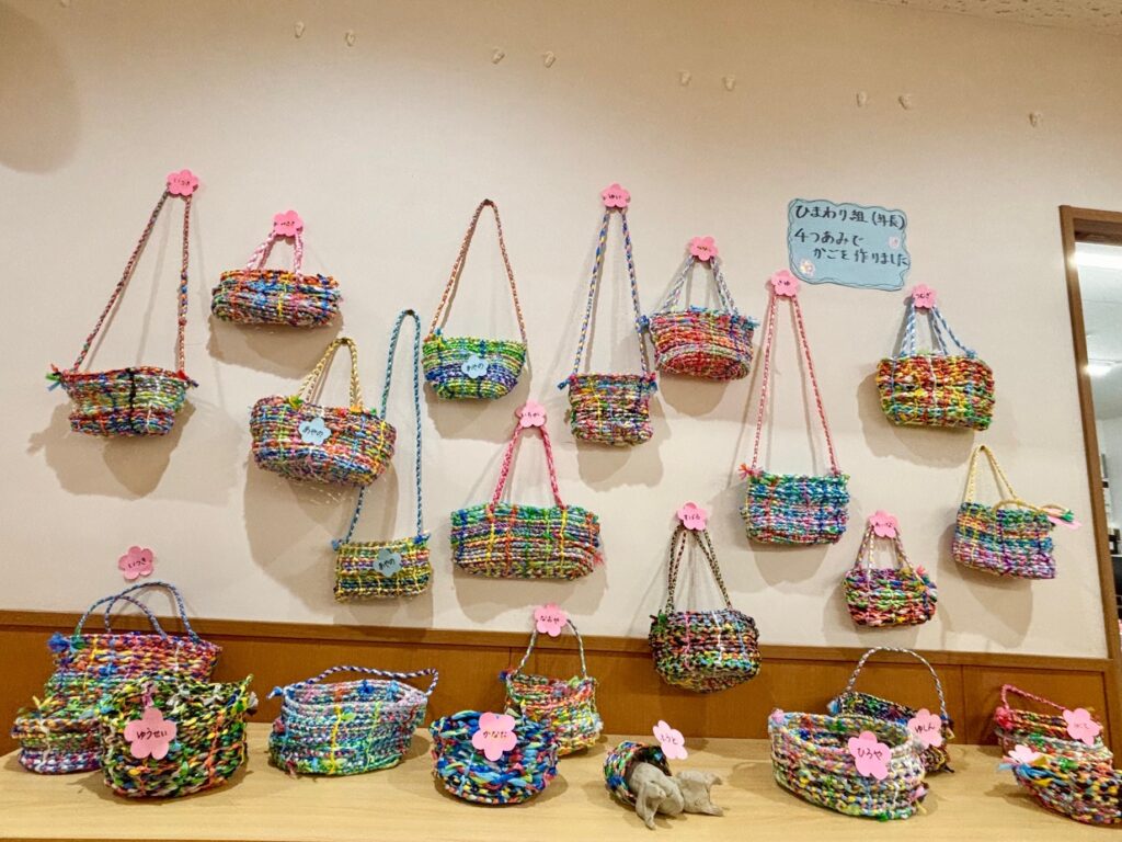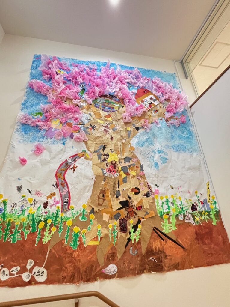 年長児全員で、壁一面に大きな桜の木を作り上げました!桜を中心に、花や昆虫等、思い思いの作品がちりばめられています。